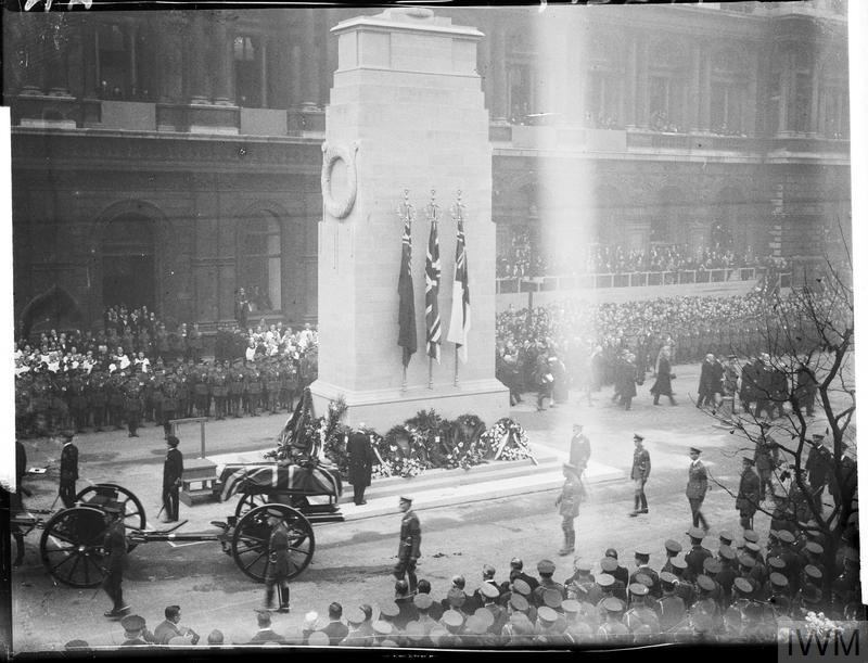 From Dover the Unknown Warrior was taken by train to Victoria Station in London where he remained overnight before the casket was placed on a gun carriage drawn by black horses of the Royal Horse Artillery in the early morning of 11th November. Huge silent crowds lined the routed as the cortege made its way to Whitehall, the only sound another Field Marshal’s salute from guns in Hyde Park. A temporary Cenotaph had been the focus of commemorations the previous year, on 11th November 1919, and this had now been replaces with a permanent structure. The gun carriage carrying the Unknown Warrior halted at this new permanent memorial which was unveiled by King George V who placed a wreath of red roses and bay leaves on the coffin, the accompanying card read ‘In proud memory of those Warriors who died unknown in the Great War. Unknown, and yet well-known; as dying, and behold they live. George R.I. November 11th 1920’. After laying his wreath the king then followed the casket on its final journey to Westminster Abbey, accompanied by other members of the Royal Family and minister of the government.