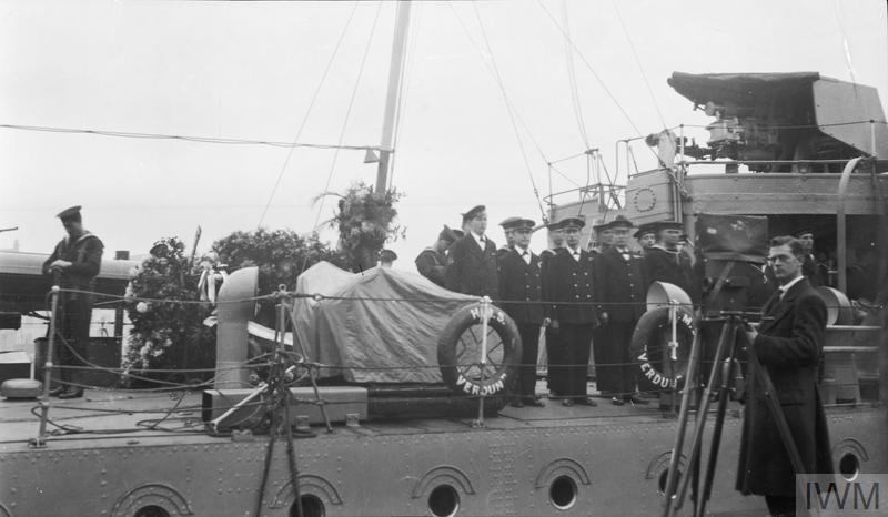 Six black horses then drew the coffin on an open waggon through the city of Boulogne and down to the harbour. The mile-long procession, escorted by a division of French troops, was led by 1,000 local schoolchildren who marched solemnly as all the church bells tolled and trumpets sounded Aux Champs (the French equivelant of The Last Post). Marshal Foch saluted the coffin as it was carried aboard HMS Verdun which was escorted across the English Channel by six battleships. Its arrival in Dover on 10th November was marked by a 19-gun salute, an honour normally reserved for a Field Marshall.