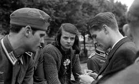 When the Second World War began with Hitler’s invasion of Poland in 1939 Sophie’s older brothers were enlisted whilst Sophie graduated from high school in 1940. She wanted to go to university to study biology and philosophy, but a pre-requisite for university admittance was for a scholar to spend time working for the Reichsarbeitsdienst (National Labour Service). Sophie wanted to avoid this if she could and so began training as a kindergarten teacher, but the ploy did not work and she was required to do the service before she could go on to study. She hated the experience with its mind-numbing routines and military outlook but persevered in the hope of finally being able to study and to marry her boyfriend, Fritz Hartnagel, who was serving on the Eastern Front.
