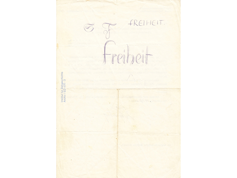 Image of Sophie’s indictment on which she wrote ‘Freedom’. Courtesy of Institute fuer Zeitgeschichte.